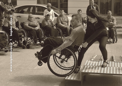 Si m-au apucat nervii. Oamenii astia se straduiesc sa invete o adevarata acrobatie in scaunele rulante, nu doar sa le foloseasca. Motivul? Romania este o tara fara rampe de acces pentru aceste persoane si pentru ca suntem nesimtiti, si pentru ca suntem zgarciti, dar principalul motiv este asta: o lege idioata prevede ca atunci cand faci o rampa de acces la o cladire deja existenta trebuie sa scoti acte cat pentru o casa. In acelasi timp, sunt zeci de institutii si companii care inca primesc avize favorabile de constructie fara sa faca astfel de rampe, pe motive hilare, gen "e la strada si n-ai voie sa construiesti pe trotuar". Inca se cumpara pe bani publici autobuze fara podea joasa, sau carora le demontam facilitatile speciale de imbarcare, dupa ce cate un bou decide ca "oricum nu le foloseste nimeni". Politicienii romani, altfel cu limba in fundul tuturor minoritatilor sexuale sau etnice, sunt orbi si surzi cand vine vorba de oamenii in scaune rulante.