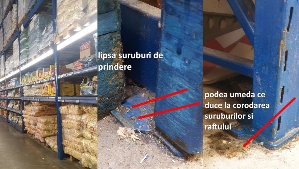 Am întâlnit toate problemele posibile. Rafturi prinse de podea cu șuruburi sănătoase, dar băltind în apă, care duce la rugină, care duce la pierderea aderenței șurub/piuliță. Rafturi imense de zeci de tone prinse de podea cu șurubele cât o scobitoare. Rafturi imense cu patru prinderi de podea în care erau doar două șuruburi montate. Rafturi fără nici o prindere de podea. Rafturi lovite, strâmbe, cu integritatea vizibil afectată. Rafturi pe role (îți dai seama cum o să fie când o pleca ăla în viteză spre tine?). În nici un magazin nu am găsit rafturile corect montate, și aici nu invoc riscul de cutremur. Invoc ce scrie în fișa acelui raft: dacă are trei găuri, pune-i în morții mă-tii trei șuruburi, nu doar unul.